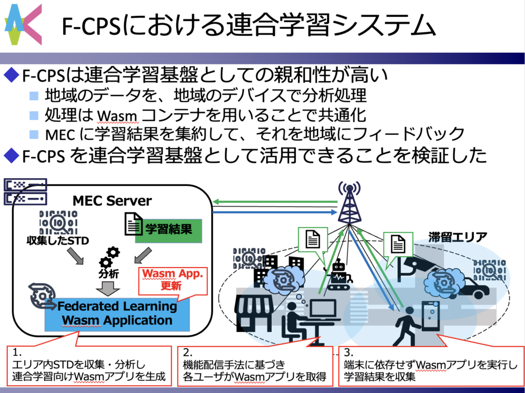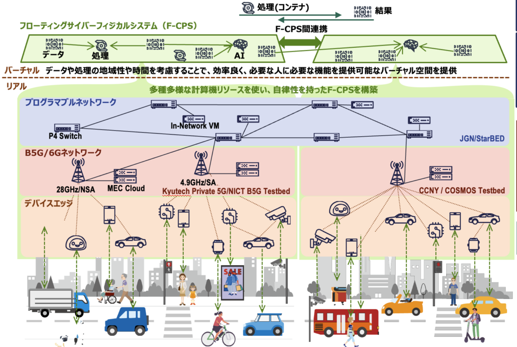 私たちの研究室では F-CPS のアーキテクチャの提案、シミュレーションによる性能評価を実施しつつ、現実空間での利用に向けて、ユースケースを想定した実機による実証実験を通してF-CPSの実現可能性を検証しています。