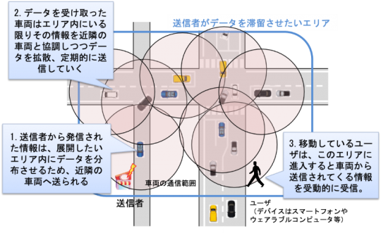 現在のインターネット基盤を用いたIoT技術では、デバイスから生成されるデータは、インターネットを経由しネットワークの先に設置されたクラウド等において蓄積され活用されるケースが多くなっています。その中で、IoTデバイスから生成されるデータには、時間的・空間的にその発生位置に強く依存する物がある事に着目しました。私たちはこのようなデータを時空間データと定義しました。このような時空間データは、現在のインターネットのようなデータ収集・蓄積型の情報基盤ではなく、データが生成された地域、または特定の場所で維持・展開されることで、その場にいる人に新しい価値を提供できると考えています。この研究では、私たちの生活の中で身近にあり、かつ将来的に高い計算資源を有する車両に着目し、車両を情報を中継するためのハブ(InfoHub)として活用することで新しい情報流通基盤を構築することを目指しています。一例として、車両を用いてユーザに直接かつリアルタイムに時空間データを届けるための手段として情報滞留手法を提案し、ネットワークシミュレーションや実機実験を通してその有効性を検証しています。